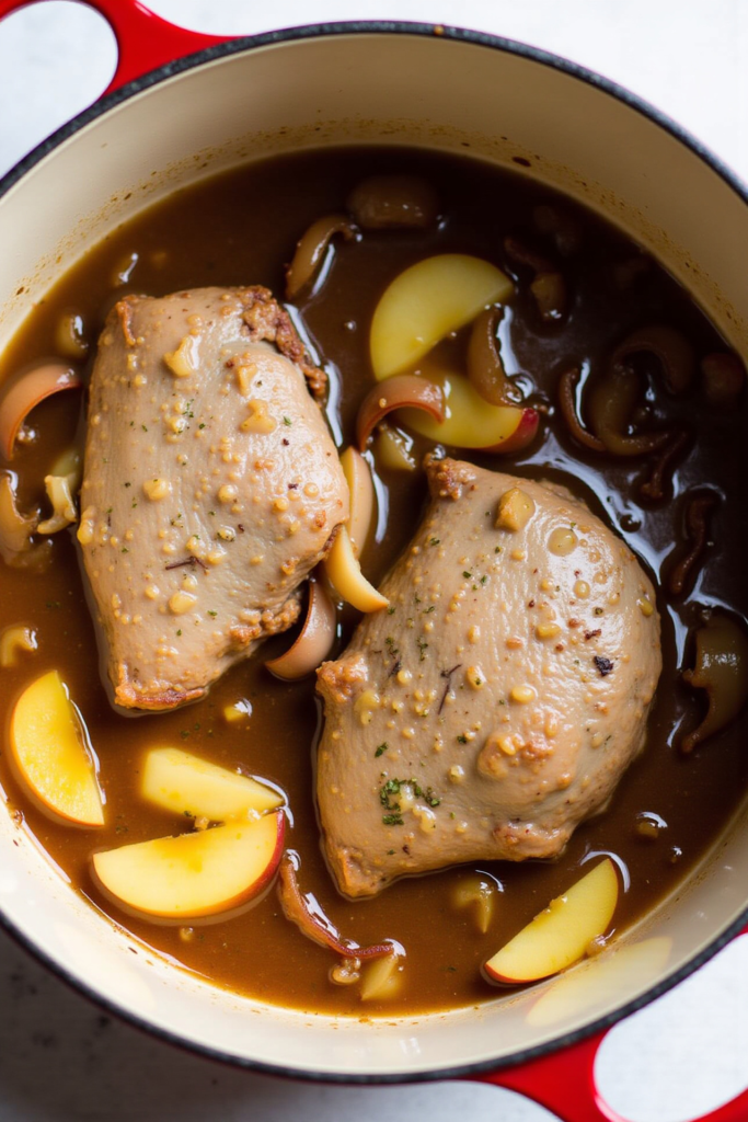 Your apple cider braising liquid is the foundation: fresh apple cider, chicken stock, Dijon mustard, and a splash of vinegar elevate the pork and complement autumnal flavors. For extra depth, add aromatics like garlic, rosemary, and thyme. This luscious combination bathes the pork as it slowly cooks, marrying sweet and savory notes into a glossy, spoonable sauce.