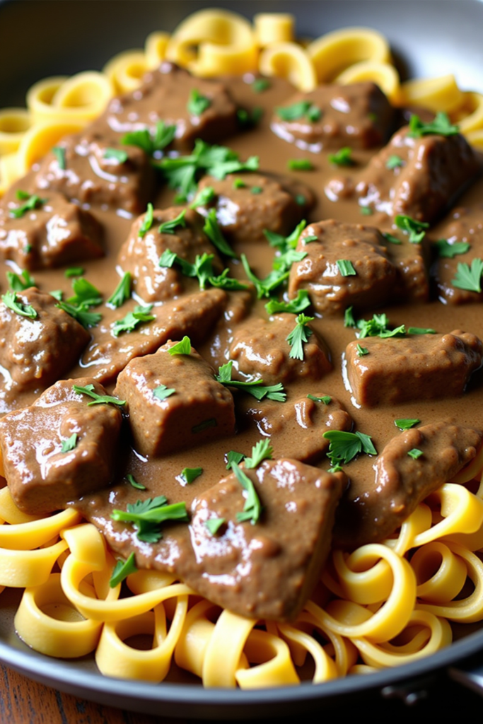 Start by browning tender strips of beef, followed by sautéing onions, garlic, and mushrooms until golden. Sprinkle in flour for thickening, then add beef broth and seasonings. Noodles cook right in the pan, absorbing the sauce. Finish with a generous spoonful of sour cream and fresh parsley for that classic stroganoff richness.