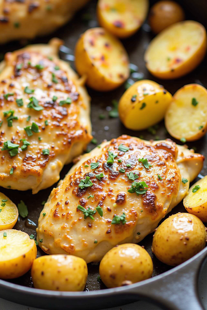 This one-pan meal unites the best flavors and textures—tender chicken, crispy potatoes, and rich garlic butter sauce. Easy, delicious, and ready in under an hour, it’s poised to become your new weeknight staple.