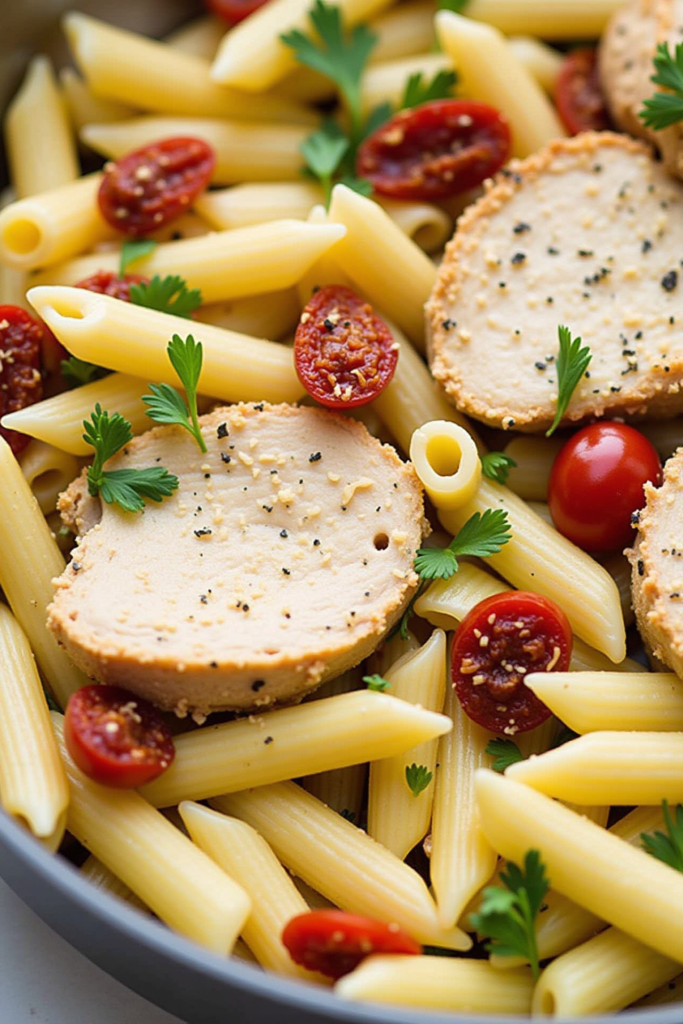 Boneless chicken breasts are seared first in olive oil, locking in juices and forming a golden crust. Sliced and simmered along with pasta, they become tender and flavorful. Short pastas like penne, rigatoni, or fusilli work perfectly to catch all that creamy sauce.